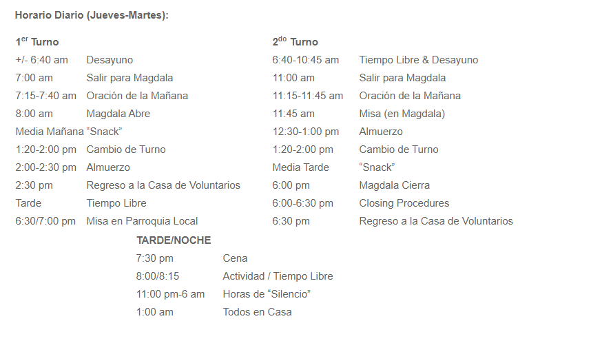 Todos los voluntarios escogen quedarse en Magdala durante algunos paseos para cubrir los turnos de trabajo. Todos los voluntarios deben hacer “guardia.” Los voluntarios trabajan en equipo para hacer el calendario mensual de turnos de “guardia.”