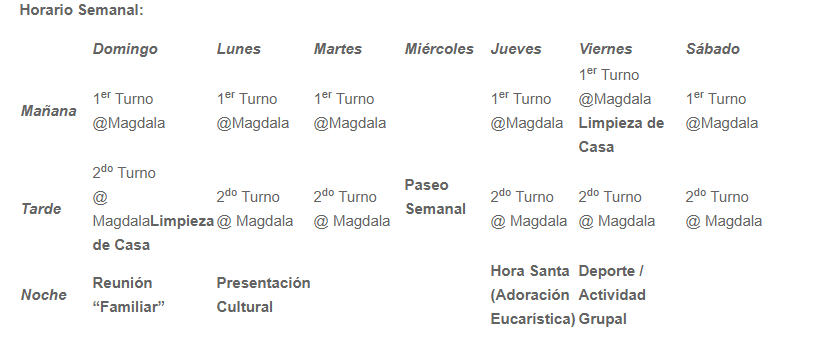 Los siguientes momentos de oración y devoción forman parte del horario diario/semanal: